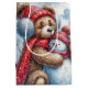 En vattenfärgsbild av en udda nalle i rött vinteromkrets omfattar ett glatt snögubbe i en snöskog. Text kan ändras eller tas bort.