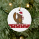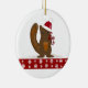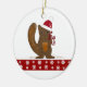 En söt design med en liten brun ekorre i en röd-vit tomtehatt med en röd rosett runt halsen. Han håller en ekollon. En kant med rött och vita snöflingor pryder den.