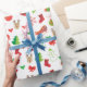 Julpapper med julfigurer. God jul och gott nytt år vackert Julpapper för älskvärda julklappar. XMAS Julpapper dekorerat med magiska jul symboler, vintersnöflingor, firande present element mönster, snöman, julgran, julklot, snöflingor och fler festliga figurer. Originell trendig grafisk design.
