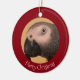 Afrikansk Grått-julprydnad, med festlig papegoja och röd bakgrund. Detta är en konstnärlig bild av min egen papegoja som önskar er ett God jul! Med vita bokstäver kan du anpassa det här objektet med egen text!