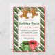 Inbjudan till helgdag med en gigantisk pepparkaksgubbe kakor och mugg kaffe eller hett kakao på en grönt med candy cane-randig bakgrund.