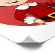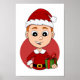 Utformning med illustration av en söt leende lycklig-pojke med ingerhår, pojken bär en Jultomten-dräkt med röd hatt och håller kvar en present, i röd cirkel på vit bakgrund