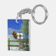 Nyckelkedja med min ursprungliga utformning av en festlig brevlåda som dekoreras för jul med rött och grönt rosett band, fullt av färgomslutna julklappar. Texten säger "God jul".