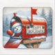 En munter från snögubbe går ut ur en röd brevlåda försedd med ett "Glad helg"-tecken, omgiven av ett snöslandskap