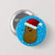 Söt glad brun potatis med glad smile och iförd röd och vit tomteluva. Bakgrunden är blå med massor av fluffiga vita snöflingor.