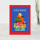 Ett julkort med en stapel av julpaket - och en liten mus, en formgivning gjord av en handmålad, papper kollage, och hälsning på portugisiska. Kontakta mig genom min butik om du vill att texten på framsidan ska ändras (t.ex. till ett annat språk) och insidan lämnas tom för ditt eget meddelande.