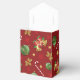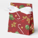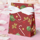 En vacker juldesign med vackra prydnadsföremål och polkagrisar mot en rustik röd bakgrund.