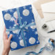 Vit julprydnad boll med snöflake mönster på blå bakgrund. Bakgrunden till färg kan ändras.