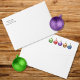 Grönt, rött, lila, guld och blå juldekorationer dekorerar baksidan av etiketten.