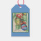 Uppsättning med 10 blå rektangulära märkre med en vintage på 1940-talet av färgstarka ornament som är bundna med band på en grönt Julgran på persikor med grönt gräns. Känslan lyder: "Julhälsningar". Baksidan är blå med en rektangel med grönten gräns och anpassadet. Se matchande hälsningskort, pussel hälsning, etikett och klistermärke. Visa hela samlingen med favoriter och Märkre för Helgdag i SPECIELLA TUUCHES | Avsnittet Party favors.