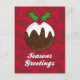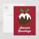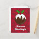 Julpudding-vykort med "Season's Greetings"-meddelande.
