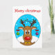Söt rolig brun ren med en ljus skinande näsa. Han har en gul fluga runt halsen och kulor hänger från hans öron. Intrasslade i hans bruna horn är ljusa skinande julbelysningar. Bakom honom är en vinterdag med vita snöflingor som faller på den snöiga marken. Ovanför står orden God Jul och inuti finns en mall för att lägga till ditt eget festliga meddelande.