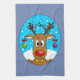 Sött roligt brunt ren med en ljus skinande näsa. Han har en gul fluga runt halsen och kulor hänger från öronen. Trasslade i hans bruna horn är ljusa skinande julbelysningar. Bakom honom är en vinterdag med vita snöflingor som faller ner på den snöiga marken.