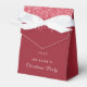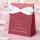 En röd bakgrund med röd faux glitter drop, lite av lek och lyx för din julfavör. Med texten: Jul Party skriven med ett modernt handskript i stil. Mall för din familj namn och ett år, vita brev. Modern och elegant.