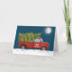 Retro red lastbil med God jul, fullt och grönt Julgran. Den blå bakgrunden färg kan ändras. All text kan redigeras.