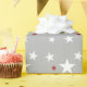 julklapp för julhelgen, i silver grått, med röda cirklar och vita stjärnor