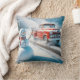 Ett glatt snögubbe står bredvid en väg när en vintage röd lastbil kör i ett snöslandskap