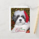 En Shih Tzu hund aveln fotograferar att ha på sig en Santa hatt som framme lägger av julgranen under julhelgerna för att hälsa god jul.