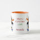 Den här söta mugg har en vacker snö-skidpenguin och din egen personlig. Penguin är klädd i en orange halsduk och blå glasögon och kissar på sin himmel. Några snöflingor går ner runt honom. Bilden upprepas två gånger, med tre fält för anpassningsbarna mellan. Festiv och smart!