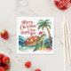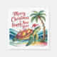 Ett finskt julhälsningskort med en glad vattenfärgad illustration av en havssköldpadda och en fin julhatt, som är försedd med en skör julklapp som är full av ljus runt sin snäcka, mot bakgrund av en svällande handflatan träd som också är belyst med varmt ljus och en serensköldpadda. Torvelens snäcka är målad med mönster av tropiska blommor i mjuka pastellhuvar av korall, lavender och grönt av skaldjur, medan havshimrarna med subtila gradienter av blått och silver skapar en fredlig men högstämd atmosfär. "GOD JUL & GOTT NYTT ÅR" visas i ett lekfullt, handskrivet typsnitt över kortets överkant, där insida erbjuder ett rent tomt utrymme för ett personlig och en subtil, som upprepar mönster från små kustceller längs grund kant för att förstärka det tropiska temat. Den övergripande tonen är ljus och glatt, perfekt för att skicka varmt önskemål till vänner och familj under julhelgen.