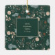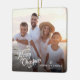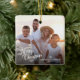 Den här enkla fotojulprydnaden innehåller "God jul" i ett modernt skript och en anpassningsbar i eleganten för din familj namn. Baksidan erbjuder en boho vintergrey mönster som visas i mjuka garner och teals på mörkens grönt baksida och erbjuder extra-text för första namn av dina familjemedlemmar.