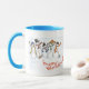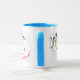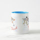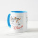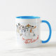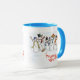 En vit ringsignal mugg med pulverblå fälg och handtag och fem jollda snögubbar på fram- och baksidan, från en handmålad vattenfärgsdesign av Judy Adamson. Den här utformningen finns också som julkort.