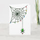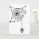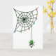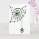 Söt och kuslig grön dekorerad spindel hänger från sitt hörnnät och håller en prydnad. Spindelnätet är täckt av ljusa julbelysningar. Stor twist på en traditionell semestervy, av Briana Blair.
