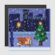 Vacker julkort av en vintersstad med ett julgran, bänk, lykta, stig och en stadsbild med inskription. Vinter julstadsbild