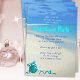 Semesterhusfest inbjudan med en tropisk strandtema. Blå himmel, blå ocean och strandsand är bakgrunden för linjer med anpassad text. Dekorerad med ett trädornament, band och en sjöstjärna. Tropiska färger av blå aqua och teal.