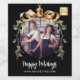 Svart bakgrund. Anpassa och lägga till egen logotyp för foton och företag. En guldbauble Julgran som ram. Lägg till en text, namn eller webben-URL.