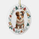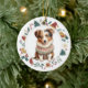 Den här söta julprydnaden har en akvarellbild av en bedårande Australian Shepherd-valp iklädd sin vintersvett. Bilden är inramad i en färgrik cirkelkrans bestående av olika julbilder, inklusive en snöman, klockor, sockerrör, julstrumpa, järnek och mer! Baksidan av prydnaden har samma kransbild med din egen text i grönt, guld och rött. Se fler Aussie-bilder och produkter på Dog Village.