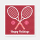 Tennis-racket-julservetter. Två tennisracketar med rött och vitt candy cane-randig handtag med rött tennis bollar. Glad helg text i grund är anpassade.