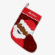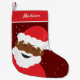 Ett anpassade namn julstrumpor med Jultomten med brun hudfärg, med röd och vit hatt. Han ler medan han tittar ut från framsidan på en burgundisk bakgrund. Jultomten Ansikte Red Brown Skin Namn Liten julklapp helgdagsdesign | ©Melissa Patton - Designer/Illustrator