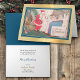 På framsidan av detta Julhälsningar kort finns en vintage bild av ett gammaldags Jultomten, komplett med elskor. Tomten, med sin väska av leksak på sin sida, tittar på två barn sova. Den närliggande kaminen visar att deras lager hängde. Bilden placeras på en ljusinfunderad övertoningsbakgrund i guld och kantas i blått med en tunn linje i guld. Insidan av kortet matchar helblått. Grund är vitt, med anpassningsbar text fält för ditt eget budskap och namnteckning. Fira julen på det gamla sättet med det här vackra kortet som visar en bild från borta dagar.