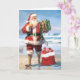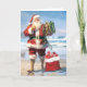 En vibrerande, tropisk strandscen med ett tydligt blå himmel-omslag. Den gyllene sandan sträcker sig så långt som öga kan se och går samman med det kristallklara vattenen av havet. I förgrunden framställs Jultomten i sin traditionella attityd. Tomten är barfoot och har rullat upp byxor för att vada i det grunda vattenen av stranden. Han håller en stor, burhöftsäck fylld med färgstark leksak som slung över axeln. Tomtens rosiga kinder och munterhet visar att han njuter av sin tid på stranden. Julhelgens visuella och roligt, med en unik tvist om den traditionella bilden av Jultomten, skapar ett minnesvärt hälsningskort för alla som tar emot den.