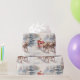 En ren Jultomten i traditionell attityd navigerar i en sled som dras av två renar i ett serenvinterlandskap, omgivet av snö-täckt träd och fallande snöflingor.