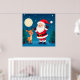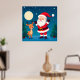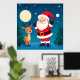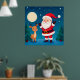 Illustration av fromma Jultomten med Rudolph den rödnosade renen under en månbelyst vinter himmel omgiven av snögiga träd.