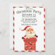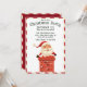 Den här julfestinbjudan innehåller ett sött och färgstarkt illustrerat vintertema. En bild av att Jultomten går ner i en skorsten som täcks av snö visas vid grund. Söt regnbåge Julens ljus är uppspända över den skorsten toppen. Gräns har en röd och vit pepparmynta candy cane stripe gräns.