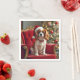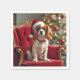 A Kung Charles spaniel hund med en Jultomten som sitter på en röd stol bredvid ett glansande Julgran med blanka ornament