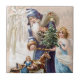 En härlig vintage belägger med tegel att presentera jultomten med en ängel och en sleighfullt av leksaker.