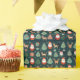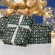 Jul Jultomten, grönt gräs träd och renar på mörk grönt grund.