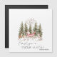 Vattenskärtligt Jultomten med lår, presenter och skog mot vit bakgrund.