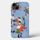 Gammal illustration God jul semesterbild med glada pojkar och flickor som har kul. Skridskoåkarna leker och åker på en frusen damm med träd och snö en solig vinterdag. God jul önskar vi!