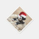 En liten, svart och vit valp ljuger bekvämt på en plush, filt med gräddfilt och kuddar med Jultomten färgad