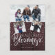 Familjestödshälsningar: 3 vykort för fotokollage på en mörk av burgiskt barrträ med fallande snö och ett kalligrafiskt skript för "julblad" med vit chic.++++++ Lätt att anpassa med foton och text på båda sidor!