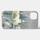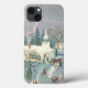 Vintage julillustration religiös design med ett sött kapell under vintersäsongen med träd täckta av snö. Människor anländer till gudstjänst med hästdragna vagnar och rök stiger upp från skorstenarna.