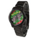 Kvinnoklockan har en 18:e utformning av händer i brutna kedjor med bakgrund av rött, gult, grönt och svart linjer.