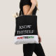 JUNETEENTH Know Thyself Tote Bag, som visar röd, svart, grönt och vit typografi som säger KNOW THYSELF - JUNETEENTH. Ord JUNETEENTH står i röd, svart och grönt fet typografi. Den här utformningen upprepas på baksidan. Denna utformning inspireras av berömden KNOW THYSELF citat från Sokrates för att uppmuntra människor att öka sina kunskaper om Junetonde och fira Black History. Idealisk för vaknade anhängare av firande från kulturafrikanskt karibiskt karibiskt karibiskt karibiskt karibiskt karibiskt klimat och skulle ge en underbar gåva till juni, jul, födelsedag, svart historiemånad och hela året. Välj mellan ett stort urval av design och matchande presenter för svart historik Månad och Junttelfte, designade av Berean Designs uteslutande för Zazzle. Matchande gåvor är tillgängliga.