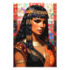 Dieses Kunstwerk zeigt ein eindrucksvolles Porträt der junge Cleopatra im königlichen Stil des antiken Ägyptens dargestellt ist. Im Mittelpunkt steht ihr ruhiger, aber kraftvoller Ausdruck, eingerahmt von langen, sorgfältig geflochtenen schwarzen Haaren, die mit goldenen Perlen verziert sind. Ein feines goldenes Stirnband betont ihre königliche Ausstrahlung. Ihr Make‑up umfasst den ikonischen, verlängerten schwarzen Eyeliner, der typisch für die Schönheitsästhetik des alten Ägyptens ist und ihrem Blick besondere Intensität verleiht.