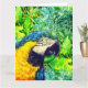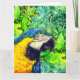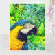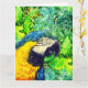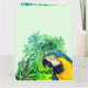Jungel fest, välkommen att fira födelsedag. En akvarellmålning av en blå gul ara i djungeln